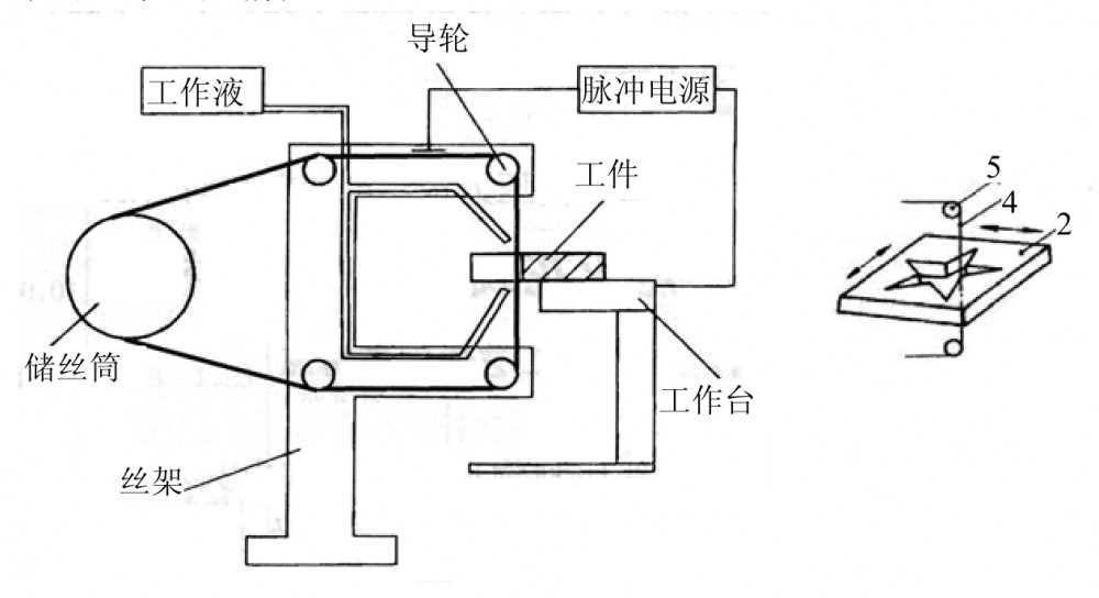 利用移动的细金属导线(铜丝或钼丝)作电极,对工件进行脉冲火花放电切割成形。利用细钼丝作工具电极进行切割,贮丝筒使钼丝作往复运动,通过电火花的放电产生的热达到金属材料的熔点后,以熔解来切割的分离金属材料的一项工艺,加工能源由脉冲电源供给。在电极丝和工件之间用工作液做介质,工作台在水平面两个坐标方向各自按预定的控制程序,根据火花间隙状态做进给移动,从而加工各种曲线轨迹,把工件切割成形。线切割加工根据工艺技术的不同分为:慢走丝线切割、快走丝线切割和中走丝线切割。在线切割中被加工的加工工件材料的难易程度与被加工材料的金属硬度无关,可以加工一切能够导电材料。